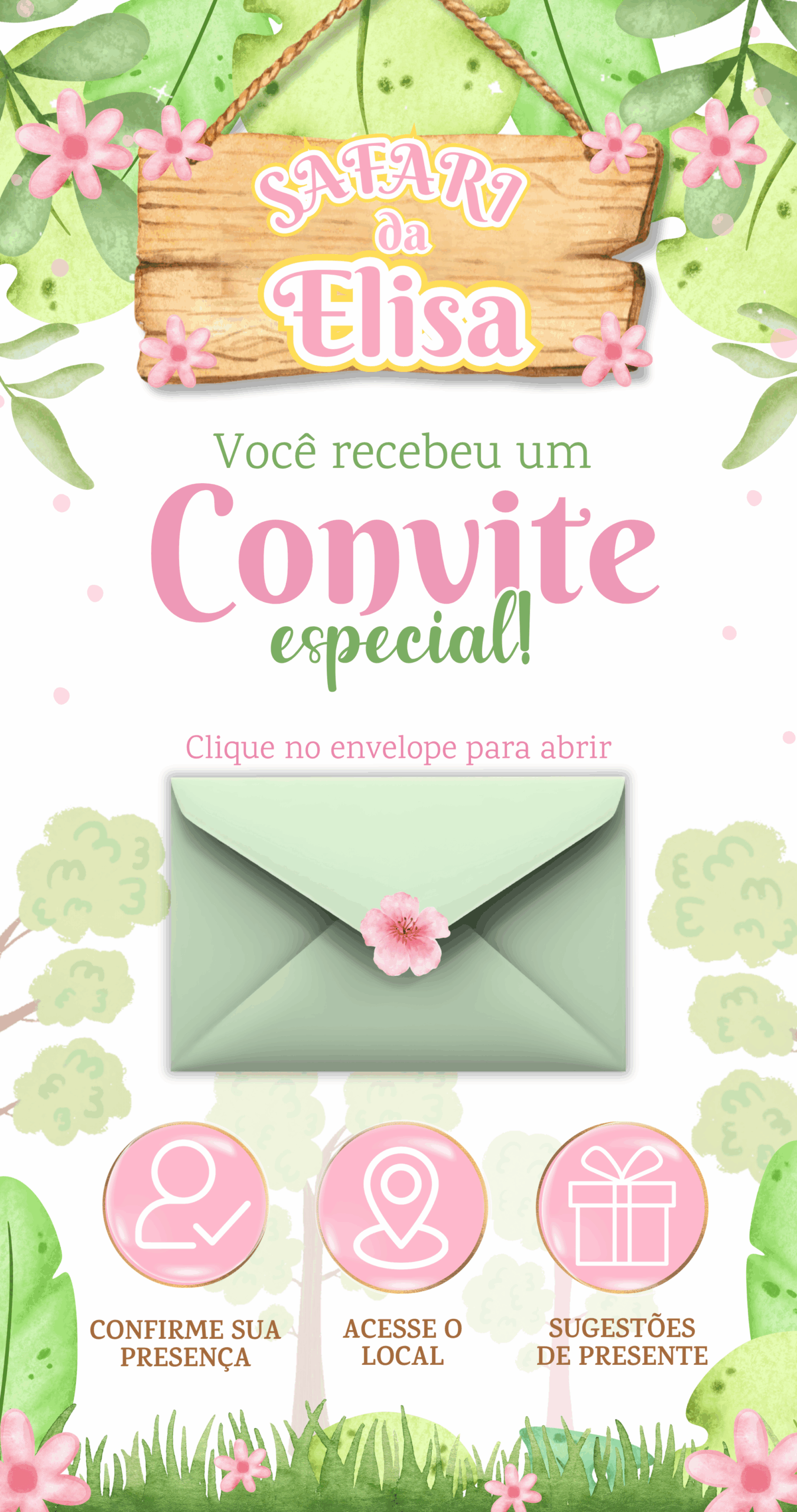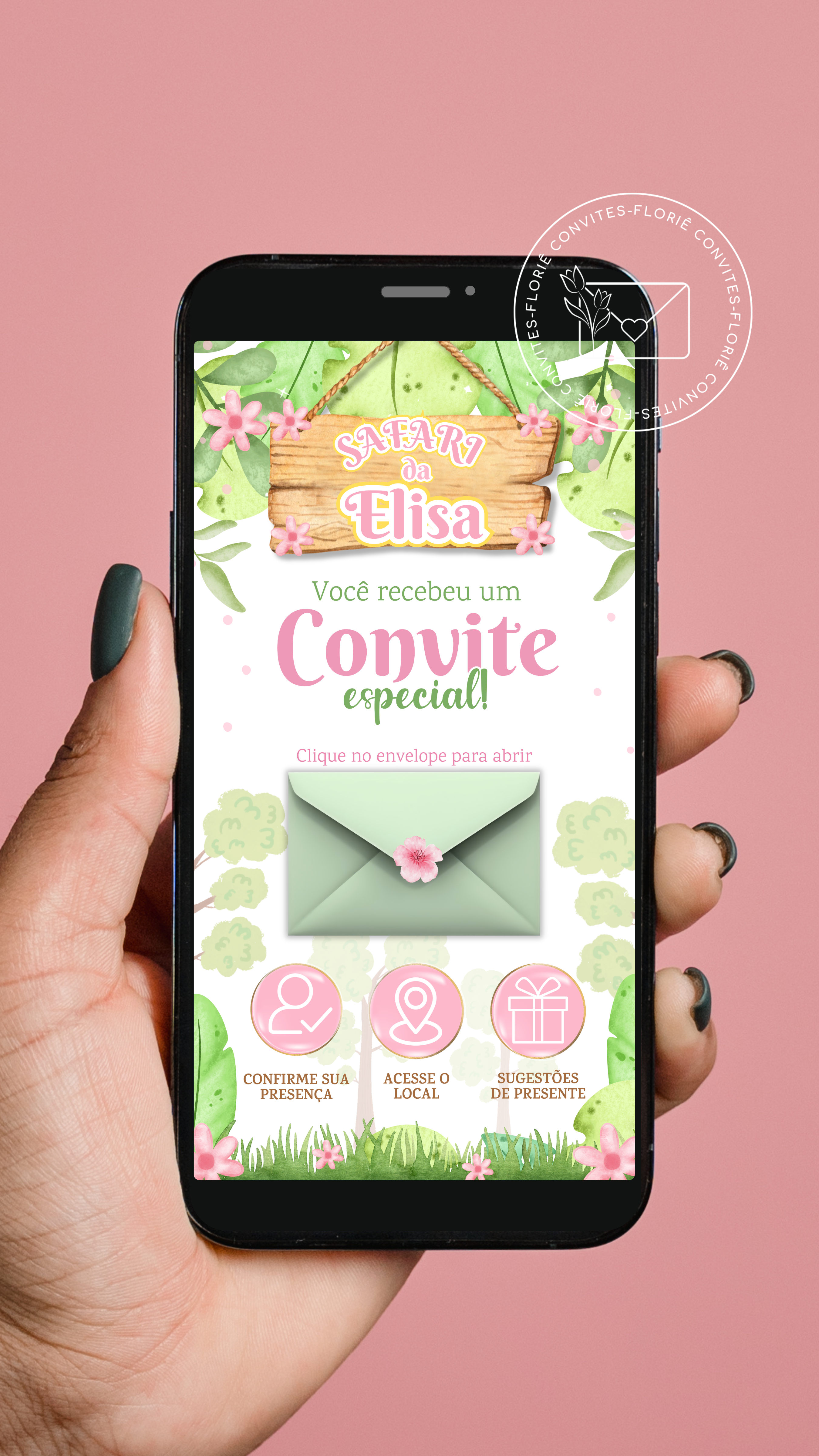 Leve seus convidados a uma aventura encantadora com o convite animado interativo Safari Rosa!