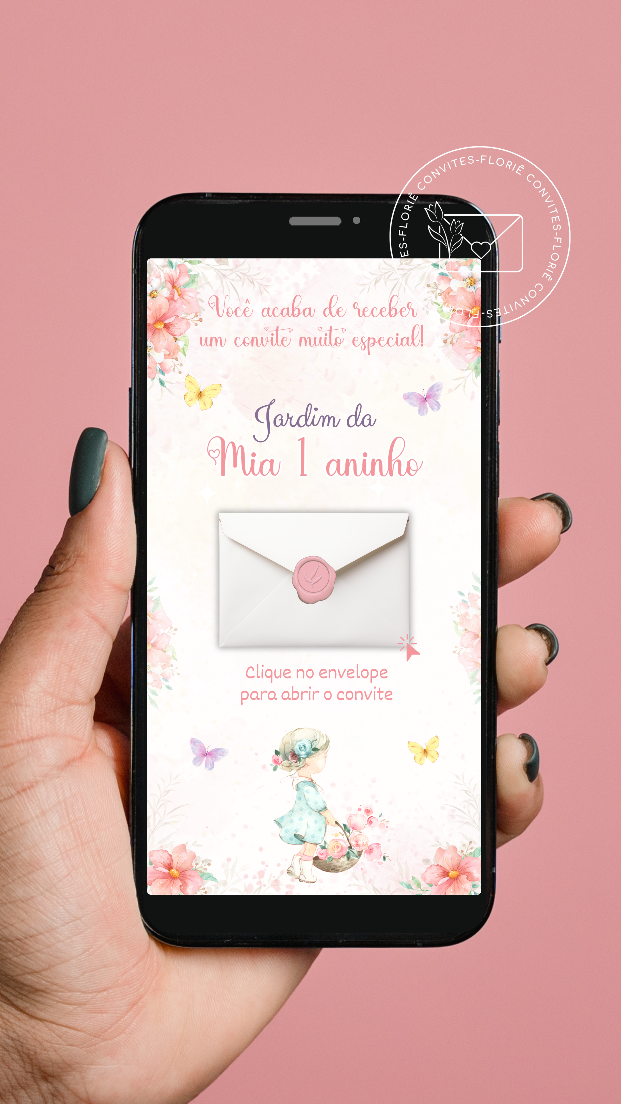 Convite animado interativo Jardim Encantado com música, animações e todos os detalhes da festa. Ideal para festas infantis delicadas e cheias de magia.